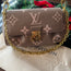 Cartera de Cadena y correa ajustable de cuero beige con detalles dorados, broche imantado, forro interior de tela con logos y códigos